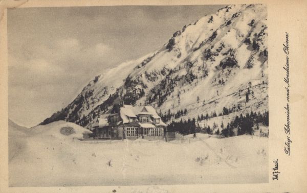 Schronisko nad Morskim Okiem w zimie. Na marginesie wydrukowane nazwisko fotografa i tytuł.