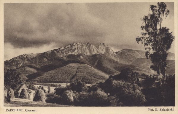Widok na Giewont z Zakopanego. Pod zdjęciem wydrukowany tytuł i nazwisko fotografa.