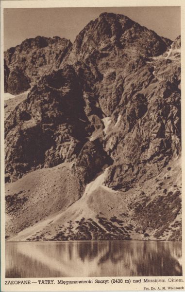 Wielki Mięguszowiecki Szczyt nad Morskim Okiem w Dolinie Rybiego Potoku. Pod zdjęciem drukowany opis: ZAKOPANE - TATRY. Mięguszowiecki Szczyt (2438 m) nad Morskiem Okiem. Fot. Dr A. M. Wieczorek.