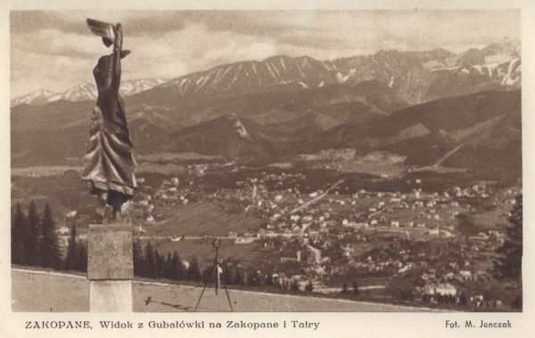 Widok ogólny z Gubałówki na Zakopane. W tle panorama Tatr. Na pierwszym planie rzeźba Polonia Restituta. Pod zdjęciem wydrukowany tytuł i nazwisko fotografa.
