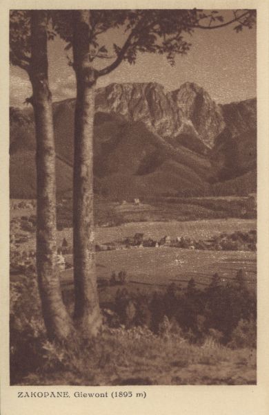 Widok na Giewont ze zbocza Gubałówki. Pod zdjęciem drukowany tytuł: ZAKOPANE. Giewont (1895 m).