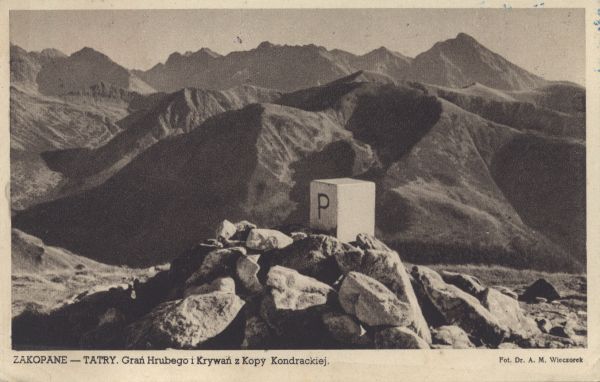 Widok z Kondrackiej Kopy. Od lewej: Koprowy Wierch, Szczyrbski Szczyt, Hruby Wierch, Krywań. Pośrodoku Wielka Kopa Koprowa. Z lewej Dolina Wierchcicha. Pod zdjęciem wydrukowany tytuł i nazwisko fotografa.