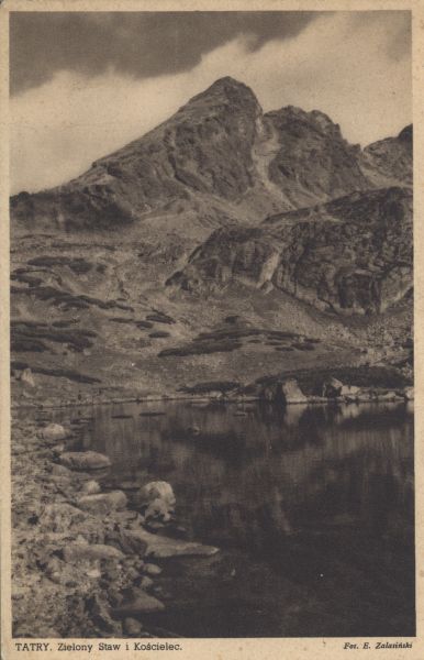 Zielony Staw Gąsienicowy, nad nim Kościelec. Pod zdjęciem wydrukowany tytuł i nazwisko fotografa.