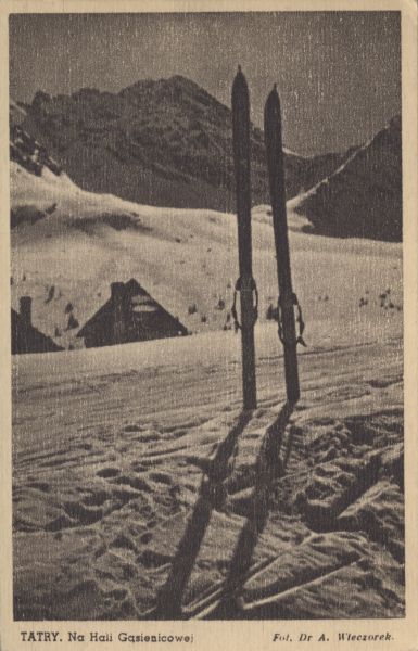 Narty wbite w ¶nieg na Hali G±sienicowej. Z lewej widoczny budynek stacji meteorologicznej. W tle szczyt ¦winicy. Pod zdjęciem wydrukowany tytuł i nazwisko fotografa.