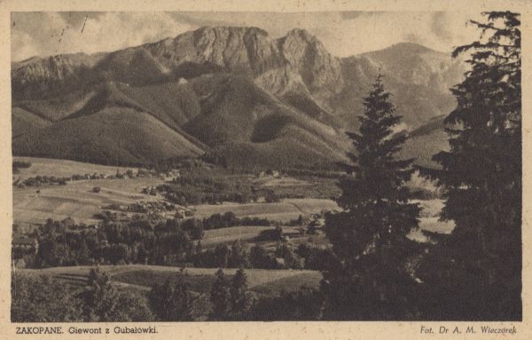 Widok na Giewont z Gubałówki. W dole Zakopane. Pod zdjęciem wydrukowany tytuł i nazwisko fotografa.