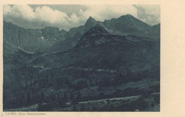 Dolina G±sienicowa. W tle grań Tatr Wysokich, w ¶rodku szczyt Ko¶cielca. Pod zdjęciem wydrukowany tytuł.