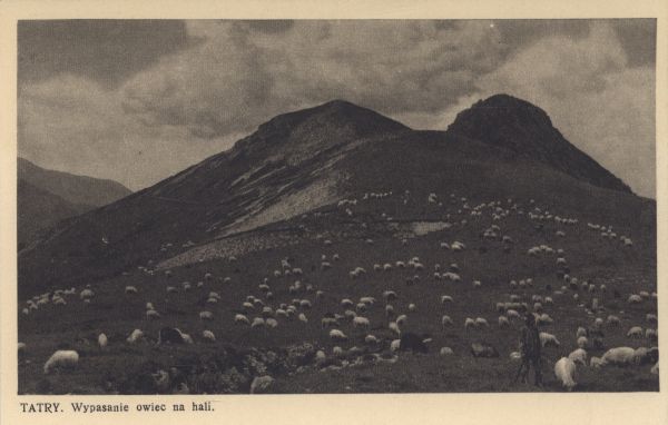 Wypasanie owiec na hali. Pod zdjęciem wydrukowany tytuł.