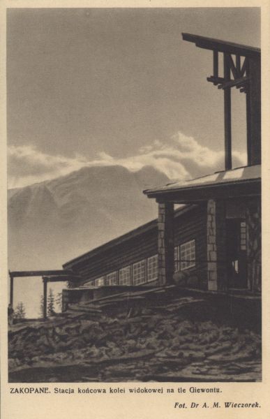 Górna stacja kolei linowo-terenowej na Gubałówce. W tle Giewont. Pod zdjęciem wydrukowany tytuł i nazwisko fotografa.