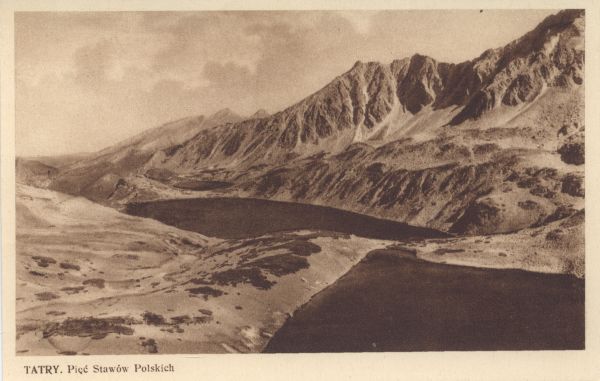 Dolina Pięciu Stawów Polskich: wyżej Wielki Staw Polski, niżej Czarny Staw Polski. Nad nimi Opalony Wierch, w tle Hawrań. Pod zdjęciem wydrukowany tytuł.
