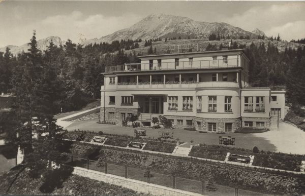 Vysoké Tatry - Horný Smokovec 1000 m n. m. Vila Helios, v pozadí Slavkovský štít 2453 m m. m.