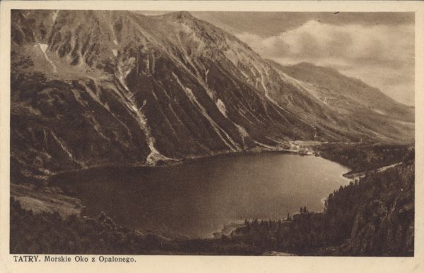 Widok na Morskie Oko z progu skalnego Czarnego Stawu pod Rysami. W tle Opalony Wierch i Wołoszyn. Pod zdjęciem drukowany tytuł: TATRY. Morskie Oko z Opalonego.
