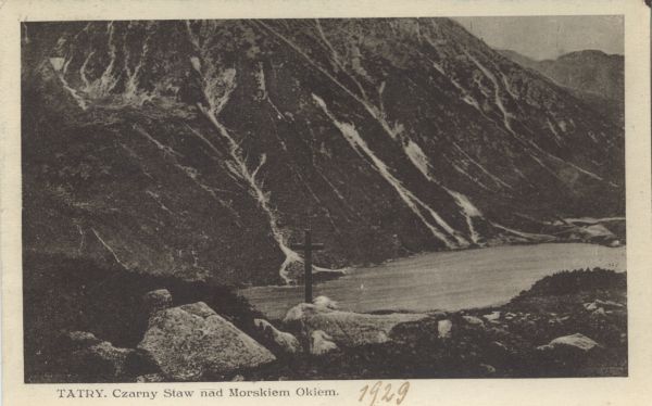 Krzyż nad Czarnym Stawem pod Rysami. W dole Morskie Oko w Dolinie Rybiego Potoku. Pod zdjęciem drukowany tytuł: TATRY. Czarny Staw nad Morskiem Okiem. Dopisane ołówkiem 1929.