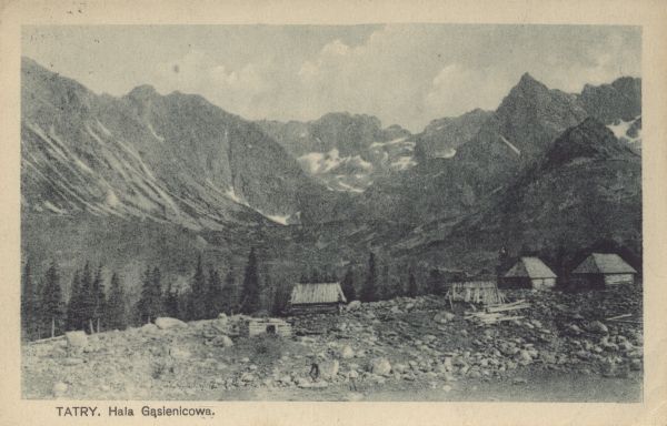 Szałasy na Hali G±sienicowej. W tle otoczenie Czarnego Stawy G±sienicowego: Żółta Turnia, Kozi Wierch i Ko¶cielec. Pod zdjęciem drukowany tytuł: TATRY. Hala G±sienicowa.