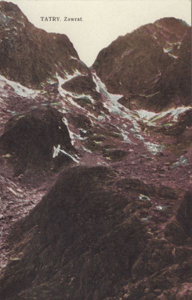 Widok na Zawrat znad Zmarzłego Stawu. U góry nadruk: TATRY. Zawrat.