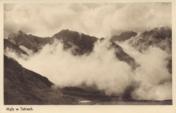 Mgły w Tatrach. Pod zdjęciem drukowany tytuł: Mgły w Tatrach.