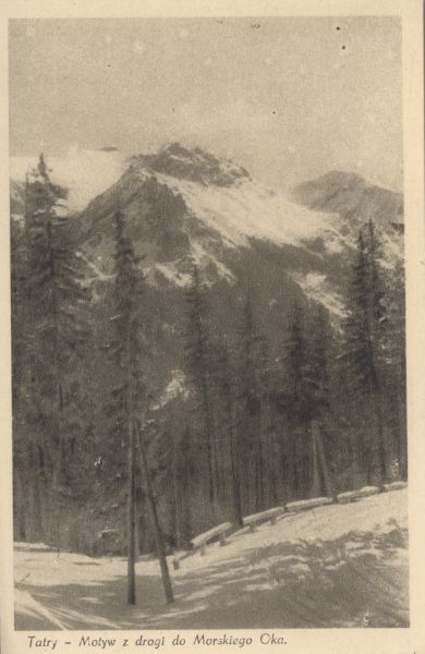 Szeroka Jaworzyńska widoczna z drogi do Morskiego Oka zimą. Pod zdjęciem drukowany tytuł: Tatry - Motyw z drogi do Morskiego Oka.