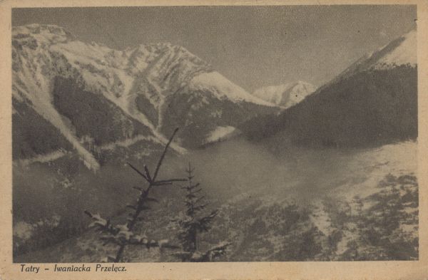 Iwaniacka Przełęcz zimą. Z lewej Kominiarski Wierch, nad nią Ciemniak. Pod zdjęciem wydrukowany tytuł.