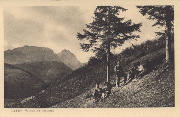 Widok na Giewont z pasma Gubałówki. Na pierwszym planie turyści. Pod zdjęciem drukowany tytuł: TATRY. Widok na Giewont.