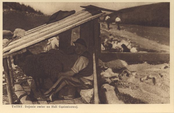 Dojenie owiec na Hali G±sienicowej. Pod zdjęciem drukowany opis: TATRY. Dojenie owiec na Hali G±sienicowej.