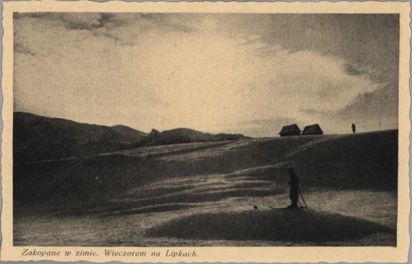 Narciarze wieczorem na Lipkach w Zakopanem zimą. Pod zdjęciem drukowany tytuł: Zakopane w zimie. Wieczorem na Lipkach.