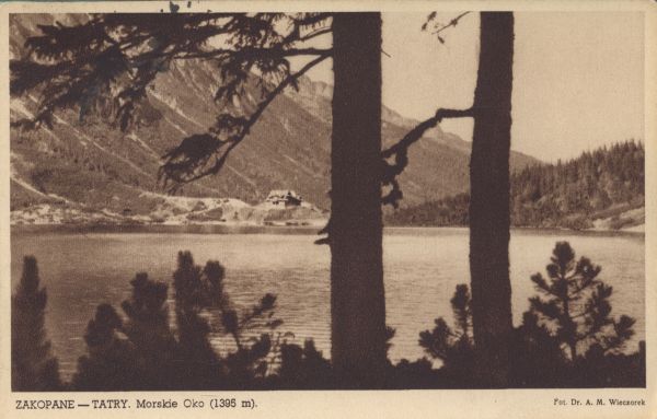 Morskie Oko w Dolinie Rybiego Potoku. Nad brzegiem widoczne schronisko. Pod zdjęciem drukowany opis: ZAKOPANE-TATRY. Morskie Oko (1395). Fot. Dr A. M. Wieczorek.