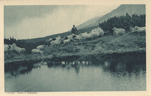 Owce z juhasem pasące się na hali nad brzegiem stawu. Pod zdjęciem drukowany tytuł: TATRY. Owce z juhasem.