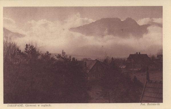 Widok na Giewont w chmurach z Zakopanego. Pod zdjęciem drukowany opis: ZAKOPANE. Giewont w mgłach. Fot. Bośniacki.