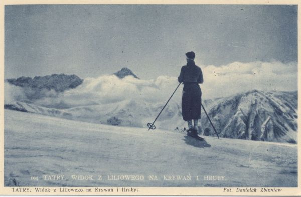 Narciarz na Liliowym w zimie. W tle Hruby Wierch i Krywań w chmurach. Pod zdjęciem wydrukowany tytuł i nazwisko fotografa.