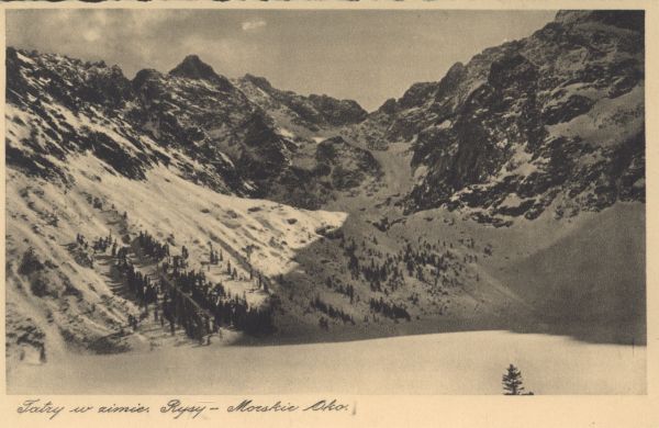 Morskie Oko w Dolinie Rybiego Potoku zimą. Nad nim Rysy. Pod zdjęciem drukowany tytuł: Tatry w zimie. Rysy - Morskie Oko.