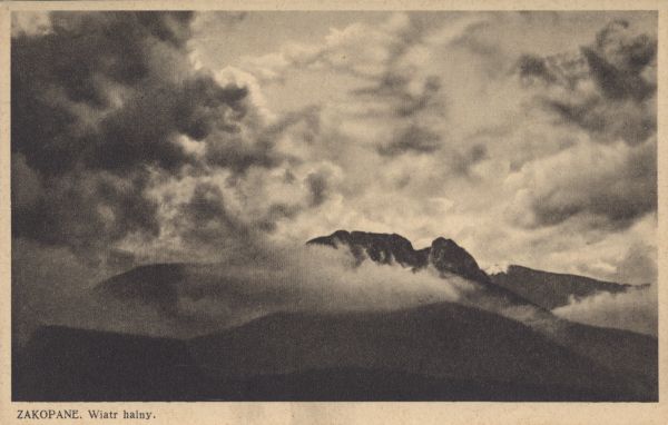 Wiatr halny nad Giewontem. Pod zdjęciem drukowany tytuł: ZAKOPANE. Wiatr halny.