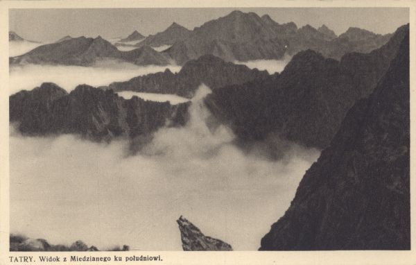 Widok z Miedzianego ku południowi na szczyty w morzu chmur. Pod zdjęciem drukowany tytuł: TATRY. Widok z Miedzianego ku południowi.