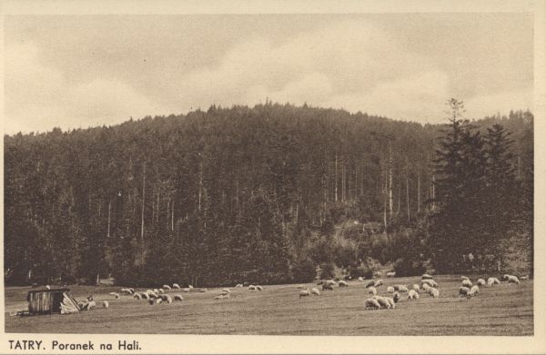 Wypas owiec na hali. Pod zdjęciem drukowany tytuł: TATRY. Poranek na Hali.