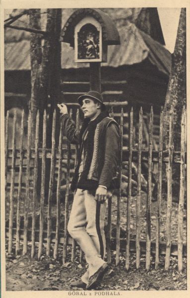 Portret górala z Podhala stojącego pod kapliczką przydrożną. Pod zdjęciem drukowany tytuł: GÓRAL Z PODHALA.