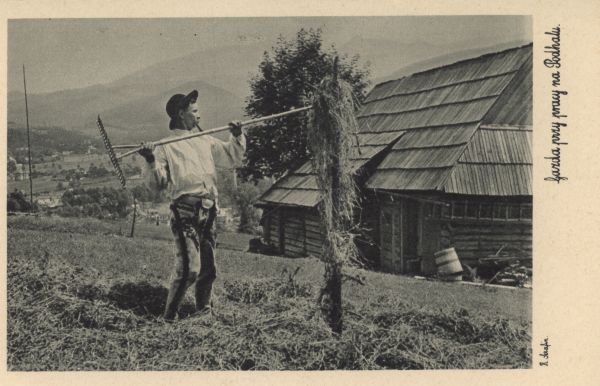 Góral układający skoszoną trawę w kopę. Na marginesie wydrukowane nazwisko fotografa i tytuł.