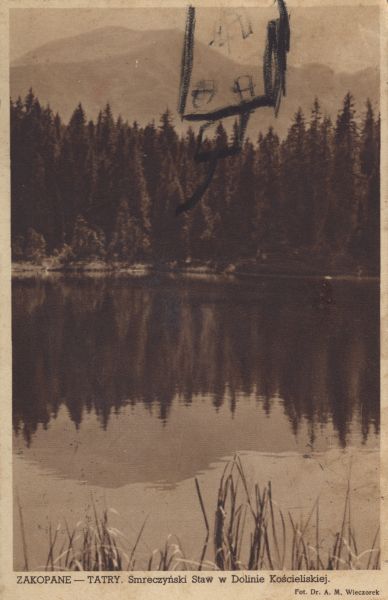 Smreczyński Staw w Dolinie Kościeliskiej. W tle Bystra. Pod zdjęciem drukowany opis: ZAKOPANE - TATRY. Smreczyński Staw w Dolinie Kościeliskiej. Fot. Dr. A. M. Wieczorek.