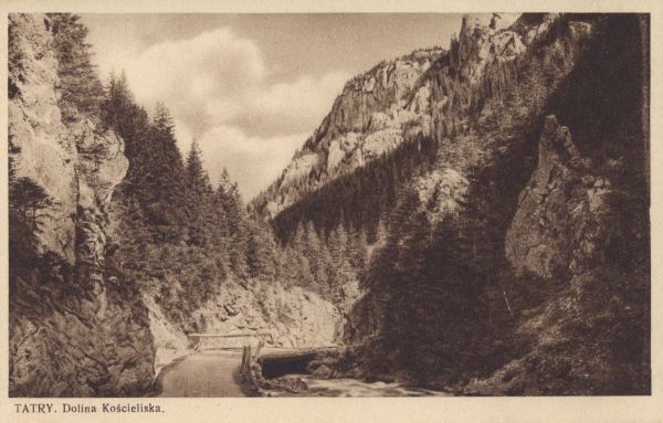 Niżnia Kościeliska Brama w Dolinie Kościeliskiej. W dole płynie Kościeliski Potok. Pod zdjęciem drukowany tytuł: TATRY. Dolina Kościeliska.