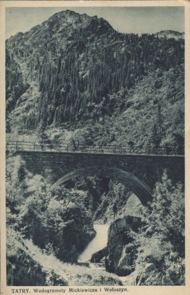 Most na drodze do Morskiego Oka. Wodogrzmoty Mickiewicza. Nad nimi Wołoszyn. Pod zdjęciem drukowany tytuł: TATRY. Wodogrzmoty Mickiewicza i Wołoszyn.