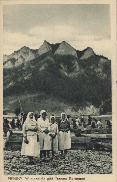 Kobiety z Czerwonego Klasztoru nad brzegiem Dunajca. W tle Trzy Korony. Na rzece płyną łodzie z turystami. Pod zdjęciem drukowany tytuł: PIENINY. W niedzielę pod Trzema Koronami.