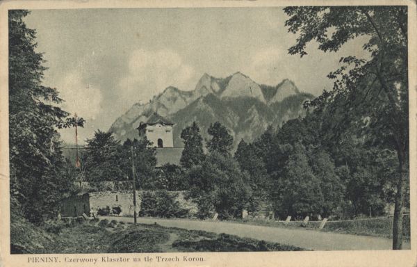 Wieża kościoła klasztornego w Czerwonym Klasztorze. W tle Trzy Korony. Pod zdjęciem drukowany tytuł: PIENINY. Czerwony Klasztor na tle Trzech Koron.