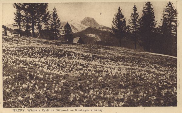 TATRY. Widok z Cyrli na Giewont. - Kwitnące krokusy.