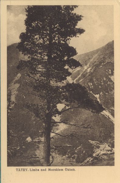 Limba (Pinus cembra l.) nad Morskim Okiem. U dołu z prawej widoczne schronisko. Pod zdjęciem drukowany tytuł: TATRY. Limba nad Morskim Okiem.