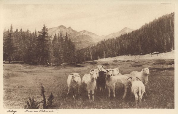 Owce pasące się na Wyżniej Polanie Małołąckiej. W tle Giewont. Pod zdjęciem drukowany tytuł: Tatry. Owce na Połoninie.