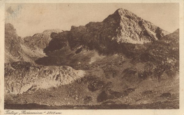 Widok na Świnicę z Doliny Gąsienicowej. Pod zdjęciem drukowany tytuł: Tatry. "Świnnica" 2308 m.