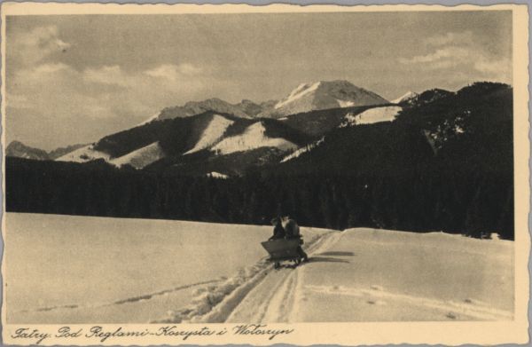 Sanie jadące drogą pod regle w zimie. W tle Koszysta i Wołoszyn. Pod zdjęciem drukowany tytuł: Tatry. Pod Reglami - Koszysta i Wołoszyn.
