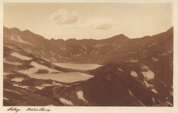 Widok na Dolinę Pięciu Stawów Polskich ze Świstówki Roztockiej. W tle Liptowskie Mury i Gładki Wierch. Pod zdjęciem drukowany tytuł: Tatry. Polskie Stawy.