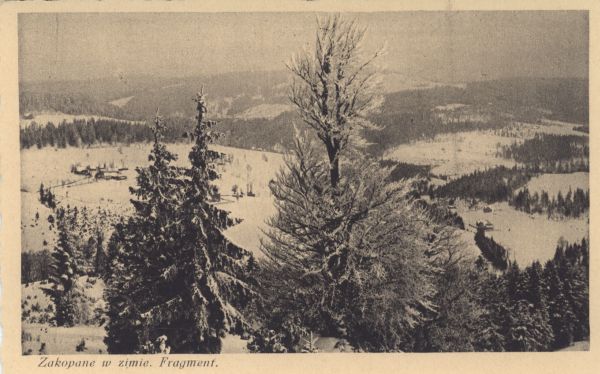 Widok na Zakopane w zimie. Pod zdjęciem drukowany tytuł: Zakopane w zimie. Fragment.