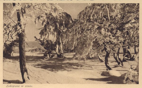 Park zakopiański w zimie. Pod zdjęciem drukowany tytuł: Zakopane w zimie.