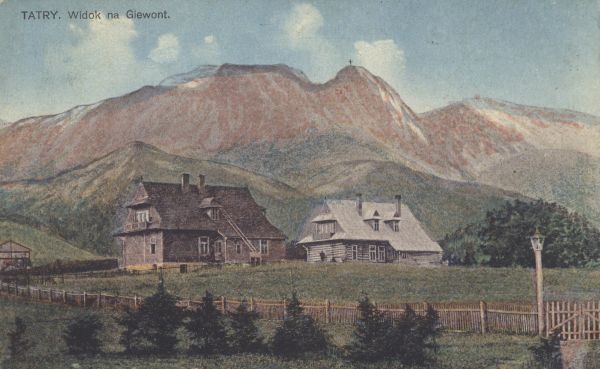 Widok z Zakopanego na Giewont. Na pierwszym planie zabudowania wiejskie. U góry zdjęcia po lewej stronie drukowany tytuł: TATRY. Widok na Giewont.