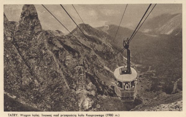 TATRY. Wagon kolej. linowej nad przepaścią koło Kasprowego (1980 m.).