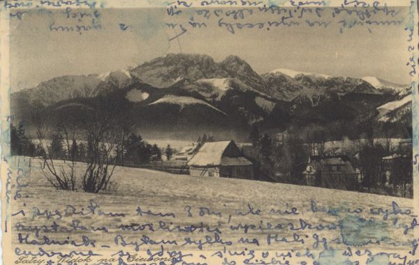 Zabudowania Zakopanego w zimie. W tle Giewont. Pod zdjęciem wydrukowany tytuł. Marginesy zapisane - korespondencja.